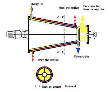 圓錐型薄膜蒸發(fā)器,依賴于轉(zhuǎn)子施于物料一個離心力,這離心力有兩個有效力,一個垂直于加熱面,另一個朝大直徑端體的方向(注意:相同的結(jié)果同樣出現(xiàn)在垂直圓錐型薄膜蒸發(fā)器里)依靠這些力產(chǎn)生物料加速,而且進入的物料保證加熱面充分潮濕,不依賴于蒸發(fā)比或進料速度。因此,局部物料過熱和熱降解被減少或完全消除。